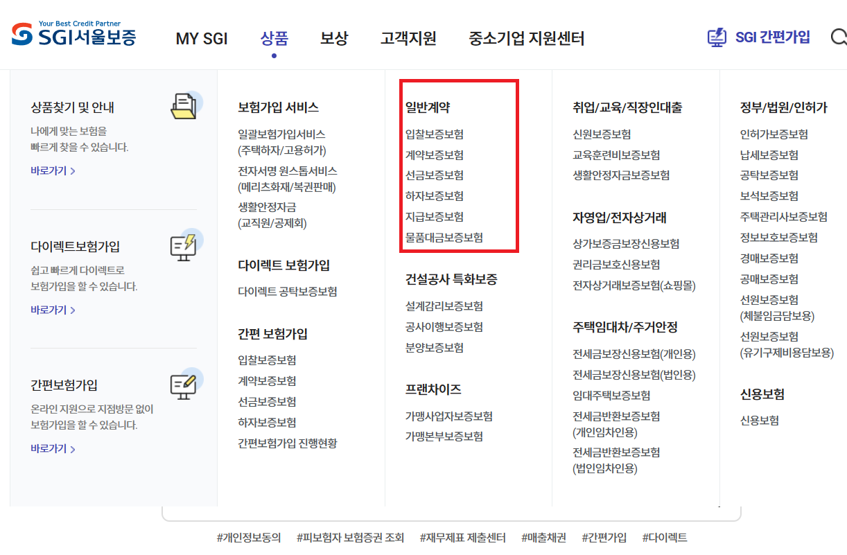SGI서울보증 (로그인) → 상품 → 해당 보증서 신청 선택