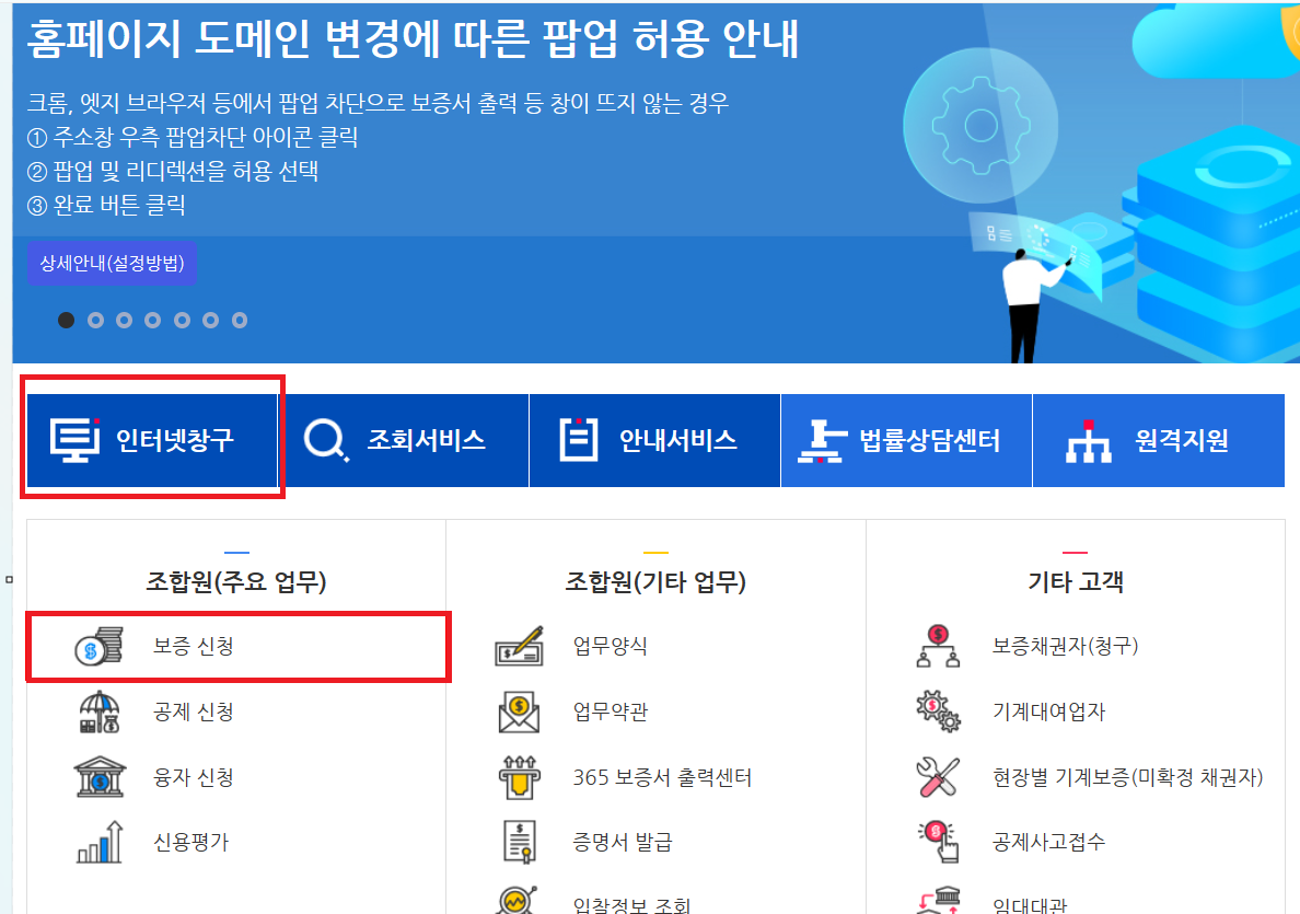전문건설공제조합 (로그인) → 인터넷창구 → 보증 수수료 계산