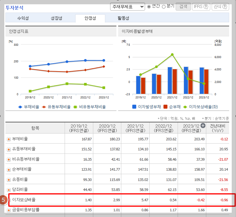 네이버증권 → 종목선택 → 종목분석 → 투자지표 → 안정성 →이자보상배율 확인 가능