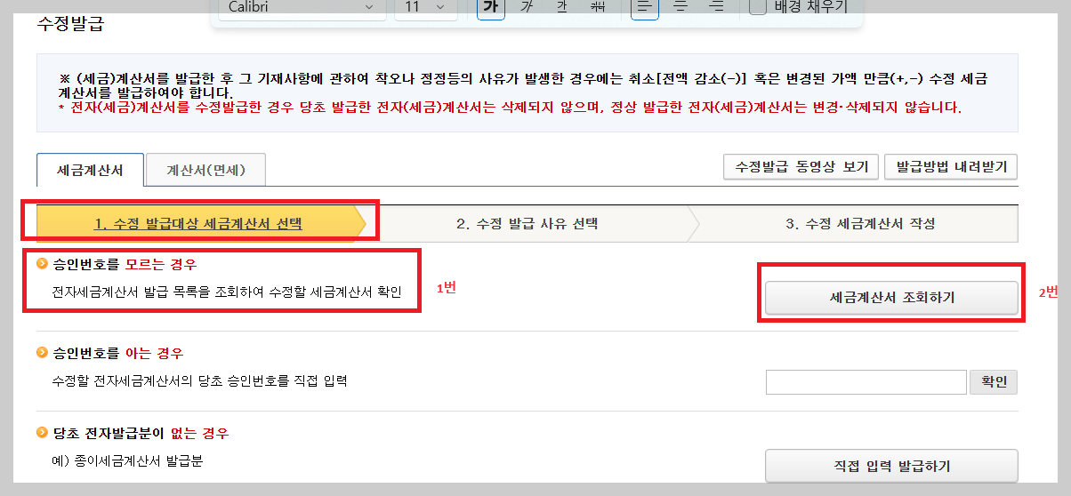 전자세금계산서 발급 → 전자세금계산서 수정발급 → 승인번호 모르는 경우로 선택→ 세금계산서 조회하기