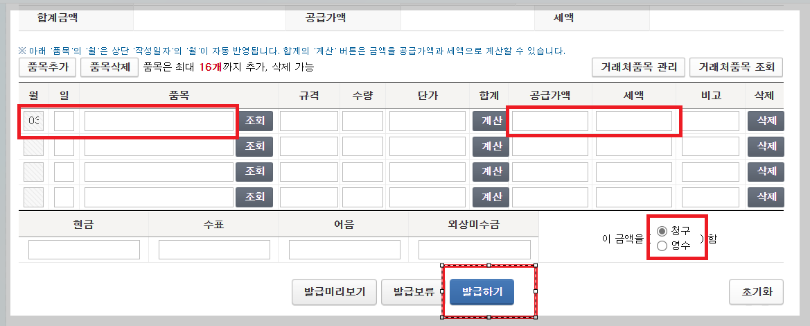 ● 거래일(작성일자와 다를 수 있음) - 품목과 규격 수량 단가를 입력하면 공급가액과 세액이 자동으로 계산됩니다.(규격과 수량 모르면 직접 공급가액과 세액을 입력)합니다.
