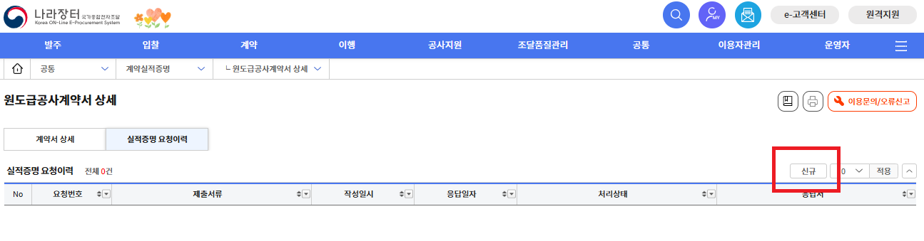 메뉴 -> 공통 ->계약실적증명 -> 계약실적검색(1년단위)-> 검색된 계약 선택후 -> 상세화면으로 이동 -> 실적증명 요청이력 탭 클릭 -> [신규] 버튼 클릭-> 저장 -> 요청